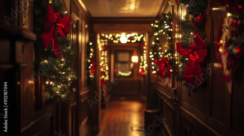 A dimly lit closet with holiday sweaters co A dark street corner with a single streetli
