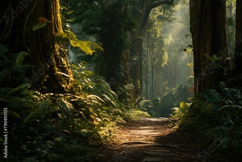 A dirt path runs through a dense forest under the morning sun rays, creating a natural pathway in the wilderness. Generative AI