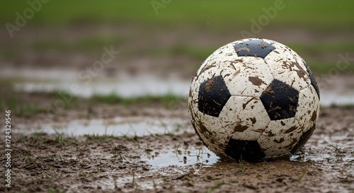 A Dirty and Mud-Covered Soccer Ball Lying on a Wet Field After a Rainy Game