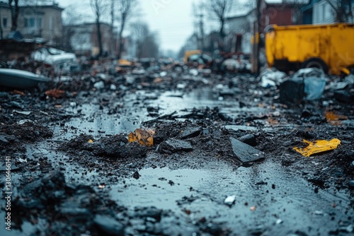 A dirty urban street with a yellow dump truck parked in the background, capturing a gritty and industrial atmosphere