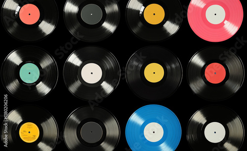 vinyl, record, music, collection, colours, label, grid, arrangement, black, background, round, retro, album, design, disc, sound, hobby, nostalgia, entertainment, studio, audio, circular, decorative, classic, vintage, listening, track, home, decor, collector, culture, art, aesthetic, boutique, unique, pattern, groove, showcase, display, vibrant, fun, variety, artistry, passion, lover, record