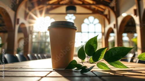 A disposable coffee cup sits on a wooden table in a sunlit hall, featuring a sprig of leaves
