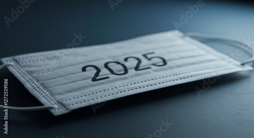 2025, year, concept, mask, face, disposable, surgical, protection, pandemic, health, care, 22, future, virus, disease, medicals, safety, hygiene, equipment, white, blue, dark, background, surface, texture, fabric, string, elastic, close, up, macro, forecast, anticipation, planning, timeline, prevention, infection, control, crisis, challenge, adaptation, change, uncertainty, minimalism, single