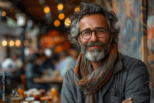 portrait, man, sophistication, maturity, confidence, wisdom, style, fashion, urban, casual attire, modern, indoor, bokeh, lifestyle, mature, elegance, charisma, thoughtful, content, relaxed, experienced, goggles, foulard, smile, grey hair, facial hair, beard, creative, professional, character, distinguished, trendy, casual clothes, serene, urban life, cafes, socialising, individuality, ambient