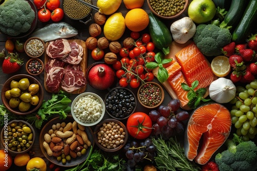 food, variety, meat, fish, fruit, nut, fresh, diverse, rustic, salmon, wholesome, assortment, hearty, diet, health, nourishment, luxurious, culinary, artistic, steak, pomegranate, walnut, strawberry, olive, grain, vibrant, bounty, protein, balanced diet, epicure, natural, omega 3, rich, decadent, colourful