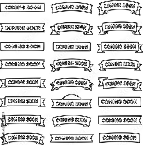 A diverse collection of 'Coming Soon' banners and ribbons, presented in a clean, black and white outline style.