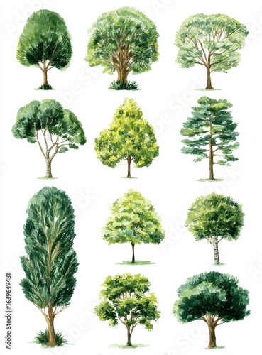 A diverse collection of hand-painted tree illustrations showcases various shapes and foliage, ideal for nature-themed designs and ecological projects.