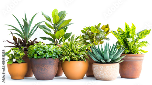 A Diverse Collection of Potted Plants Featuring Ferns, Succulents, and Other Greenery in Varied Textured Pots on a Clean White Background