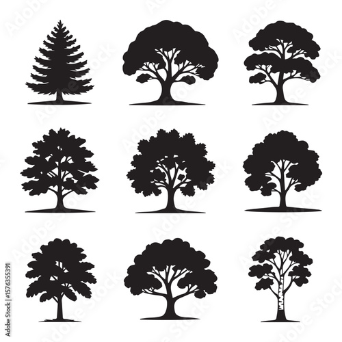 A diverse collection of tree silhouettes, showcasing various species and shapes for natural and environmental designs