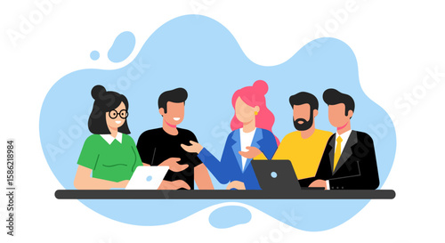 teamwork, meeting, business, people, collaboration, discussion, work, office, group, communication, strategy, planning, project, solution, success, corporate, professional, laptop, computer, technology, idea, concept, brainstorming, creative, startup, leader, manager, employee, colleague, team, diverse, modern, flat, illustration, design, graphic, vector, abstract, background, blue, desk, table, working, talking