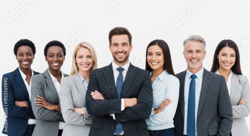 A diverse group of business professionals standing together in a professional setting.