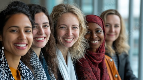 A diverse group of five smiling women, showcasing joy and unity, standing together in a bright, modern setting.