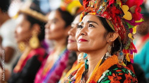 A diverse group of people attending a cultural festival, wearing traditional clothing and enjoying cultural performances.