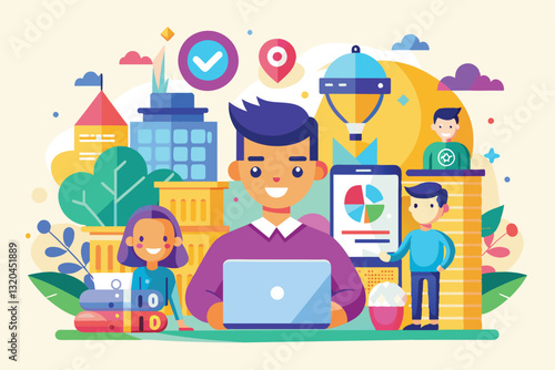 A diverse group of people engage with technology to manage social tasks in a lively office environment, Social load Customizable Flat Illustration