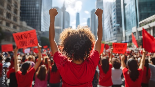 diverse, group, people, red, shirt, raise, fist, oneness, rally, vibrant, issue, support, justice, right, expression, colours, protest, banner, voice, signs, public, background, attend, awareness, movement, activism, peaceful, racked, city landscape, youth, power, progressive, human, urban, change, puckered, parade, social, activist, action