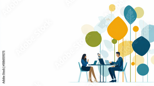 A diverse group of professionals collaborates at a table with laptops, set against a backdrop of stylized, abstract trees and colorful shapes.