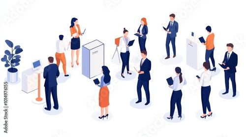 A diverse group of professionals engaged in discussions and presentations in a modern workspace setting.