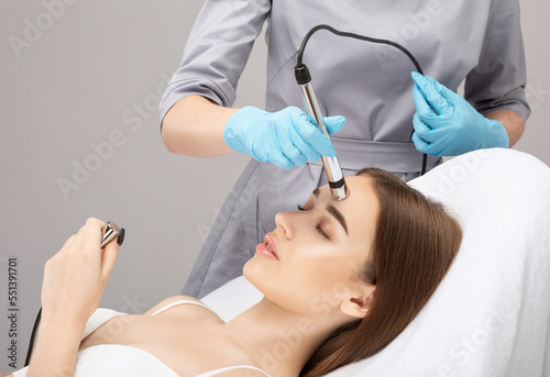 A doctor cosmetologist makes a microcurrent facial therapy to a young woman with a device in a beauty wellness salon.Cosmetology and professional skin care.