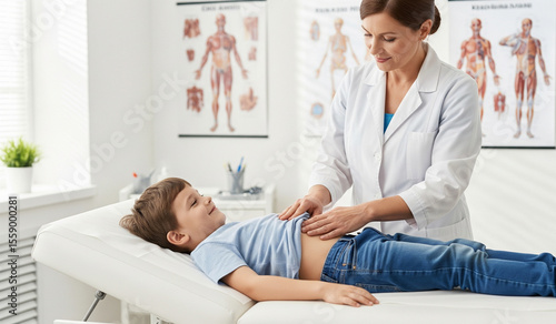 doctor, children, exam, abdomen, patient, medicals, office, health care, physician, diagnosis, therapy, treatment, care, hospital, medicine, health, well-being, physical, laying, smiling, concerned, attentive, professional, white, coat, jean, chart, poster, anatomy, exam, check-up, healthy, disease