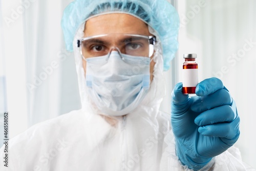 A doctor holding a vial with coronavirus Covid19 vaccine in hand.
