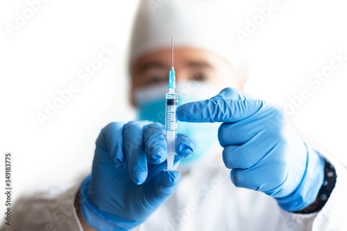 A doctor in a mask and blue gloves holds a syringe with the vaccine