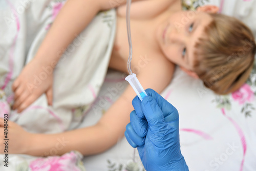A doctor in blue gloves adjusts a dropper for a sick child.