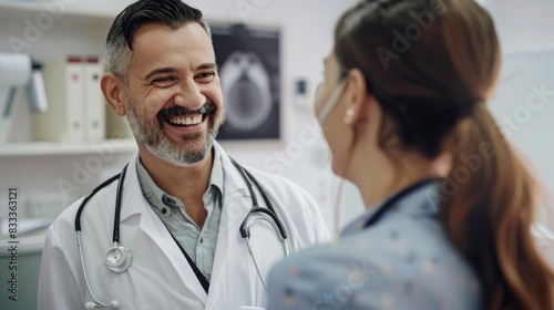 doctor, compassionate, care, smiling, patient, clinical, environment, health care, professional, medicals, white coat, stethoscope, kindness, empathy, happiness, healing, wellness, clean, serene, treatment, trust, comfort, health, medicine, clinic, positive, joy, supportive, friendly, warmth, assistance, well-being, exam, consultation, satisfaction, relief, cooperation, support, communication, doctors office, gentle, compassion, caring, professionalism, serenity