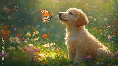 wonder, innocence, serene, calmness, harmony, playful, exploration, peaceful, sunshine, fantasy, vibrant, soft, photo, pet, creativity, joy, wildlife, freedom, butterfly, meadow, delicate, scenery, attentive, companionship, dog, happiness, life, gold, scenic, blooming, illustration, art, cute, outdoors, macro, flower, animal, colourful, beauty, grass, nature, environment, spring, garden, landscape
