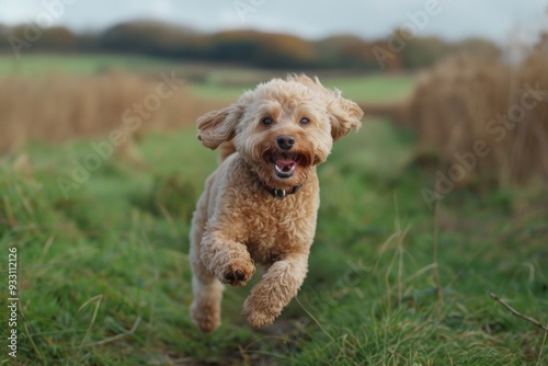 A dog runs freely through a lush green field of grass