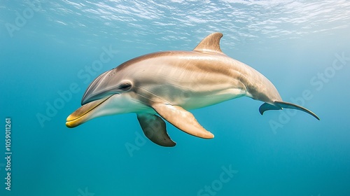 A dolphin gracefully swims underwater, showcasing its sleek body and playful nature in a serene ocean environment.