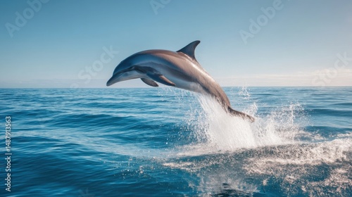 A dolphin leaps high above the ocean surface, its sleek body glistening in the sunlight, creating a dynamic splash of water as it soars through the air. : Generative AI
