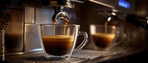 A double espresso shot is being brewed into a transparent glass cup from a professional espresso machine, showcasing rich crema and dark coffee layers