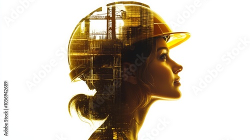 a double exposure showing a woman in a construction helmet