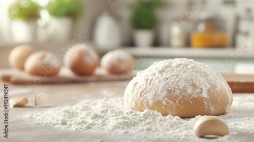 A dough ball rests on a floured wooden surface, surrounded by kitchen elements, ready for baking delicious bread or pastry