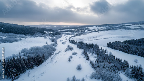 A dramatic aerial view of a snow-covered valley filled with untouched powder snow.