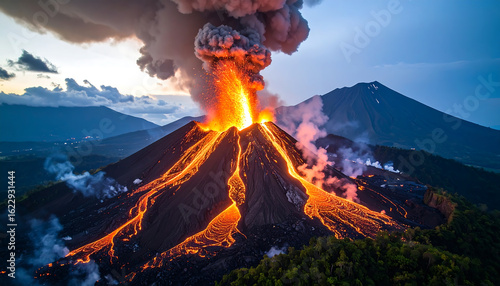 volcano, eruption, lava, ash, smoke, mountain, landscape, nature, geology, fire, orange, red, hot, molten, flow, rock, earth, sky, cloud, dark, dramatic, peak, crater, formation, structure, texture, surface, detail, natural, powerful, energy, heat, destruction, danger, environment, wilderness, remote, distance, aerial, view, perspective, up high, evening, twilight, dawn, dusk, atmosphere, vapour, stream