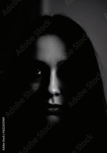 woman, girl, female, person, human, face, portrait, head shot, individual, model, dark, shadow, light, contrast, low key, chiaroscuro, monochrome, black, white, greyscale, dramatic, moody, mysterious, intense, haunting, eerie, skittish, scarey, horror, gothic, black, artistic, creative, abstract, minimalist, conceptual, eye, nose, mouth, lip, skin, hair, gaze, stare, look, expression, pupil, mystery, fear
