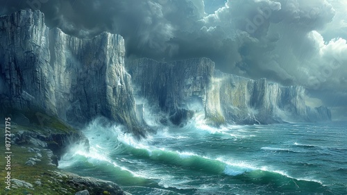 A dramatic coastal scene with towering cliffs, crashing waves, and a stormy sky, creating a moody and powerful backdrop