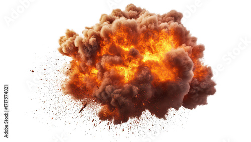 A dramatic explosion billowing smoke and fire against a stark white background. illustrating the intensity of a fiery blast. suitable for action or disaster-themed visuals