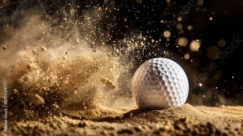A dramatic image of a white golf ball creating an explosion of golden dry sand against a stark black background.