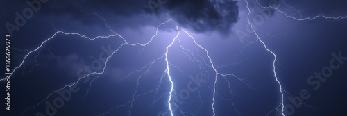 A dramatic lightning strike illuminates the dark sky during a summer thunderstorm