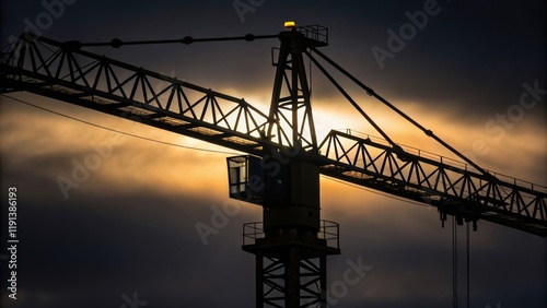 dramatic, crane, arm, silhouetted, darkening, sky, geometric, form, streak, light, conveying, power, fragility, construction, building, structure, machinery, equipment, site, architecture, skyline, industrial, silhouette, engineering