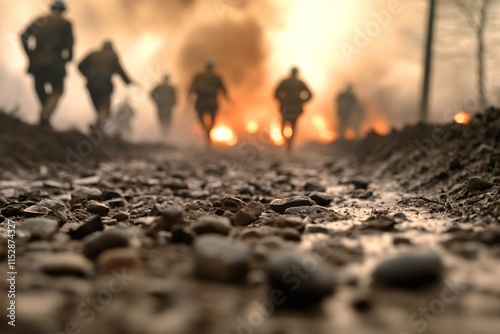 soldier, battlefield, smoke, chaos, war, honour, operation, courage, engagement, progress, mission, victory, effort, determination, leadership, movement, teamwork, fear, risk, uniform, strategy, challenge, tension, struggle, training, military, fire, power, action, ground, advance, life events, sacrifice, conflict, bravery, intensity, loyalty, survival, perseverance, adrenalin, history, assault, combat, warfare, danger, terrain, weapon, environment
