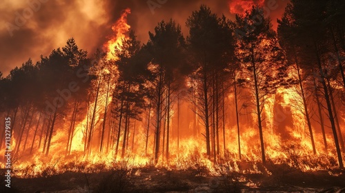 A dramatic scene of a forest engulfed in intense flames, illustrating the devastating impact of wild