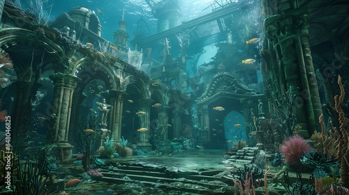 a dramatic underwater scene where an ancient city lies beneath the waves,