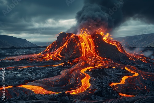 A dramatic volcanic eruption with flowing lava.