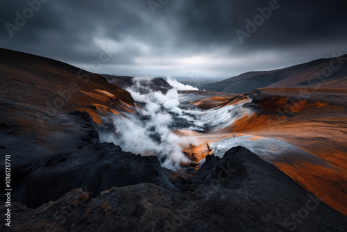 A dramatic volcanic landscape with dark volcanic rocks and red-orange geothermal areas releasing steam and smoke under a stormy sky.