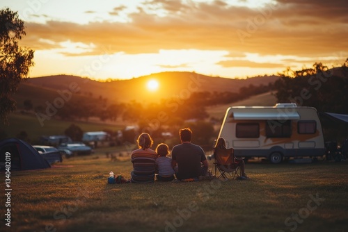 dreamy, photo, family, campground, their, back, turned, camera, gazing, sunset, over