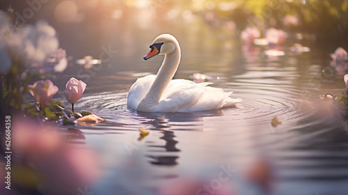 A dreamy image of a swan floating amidst water lilies, surrounded by the soft colors of a tranquil pond Generative AI