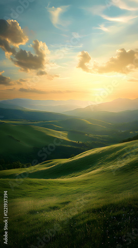 A dreamy landscape background with rolling hills and a sunset, ideal for serene designs.